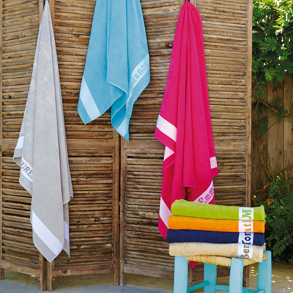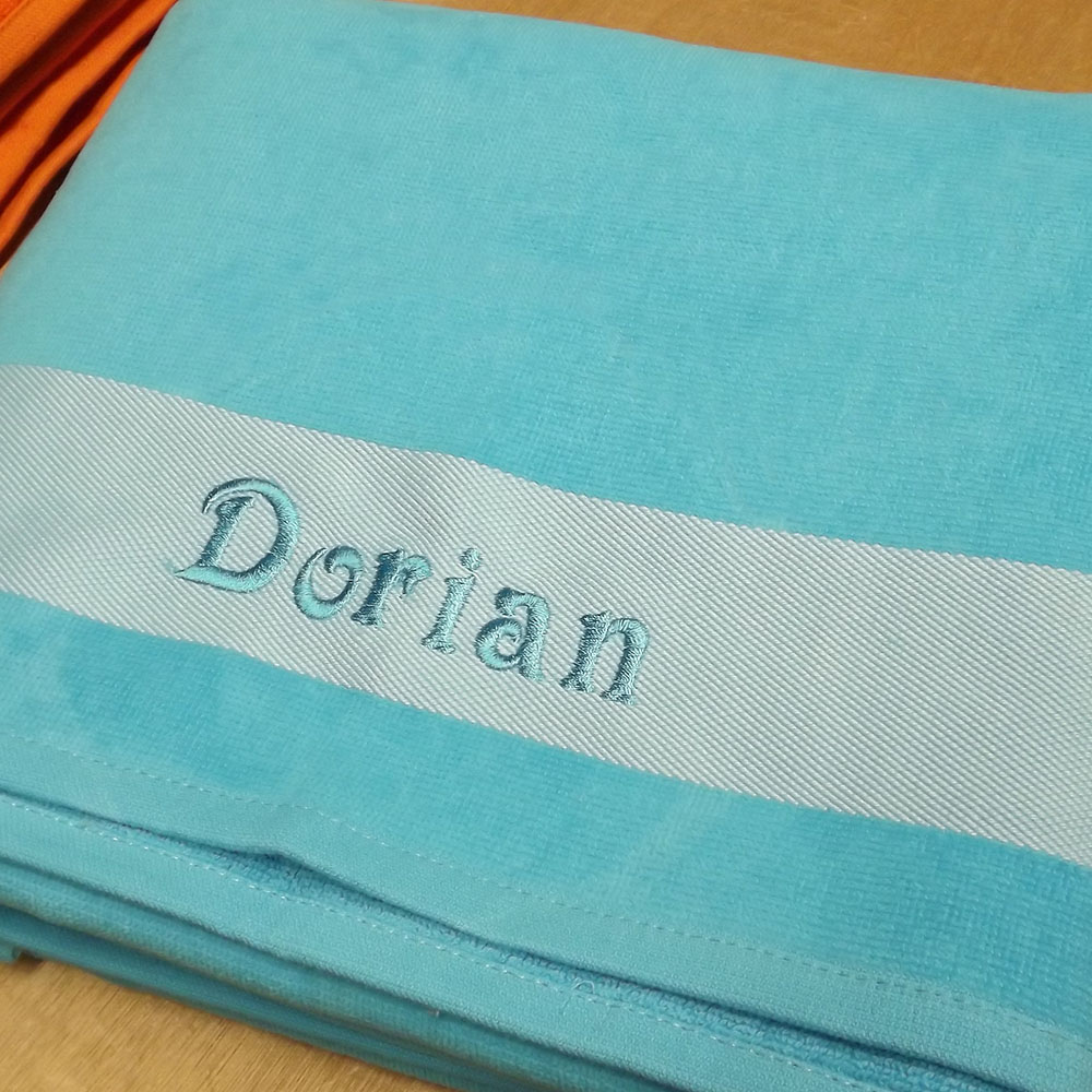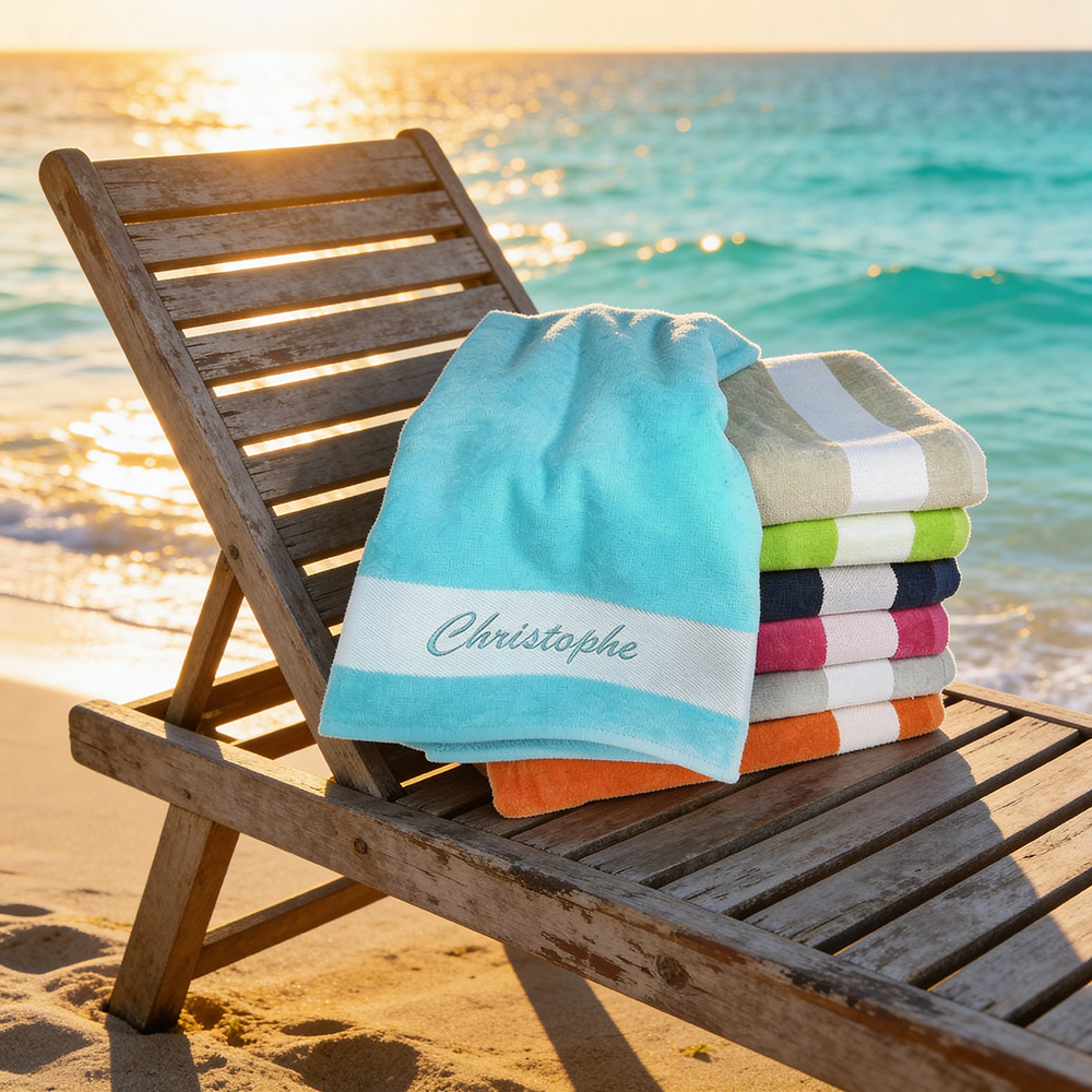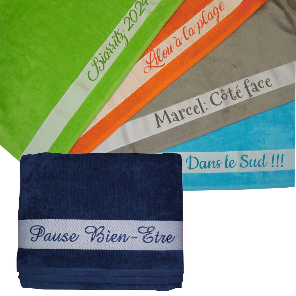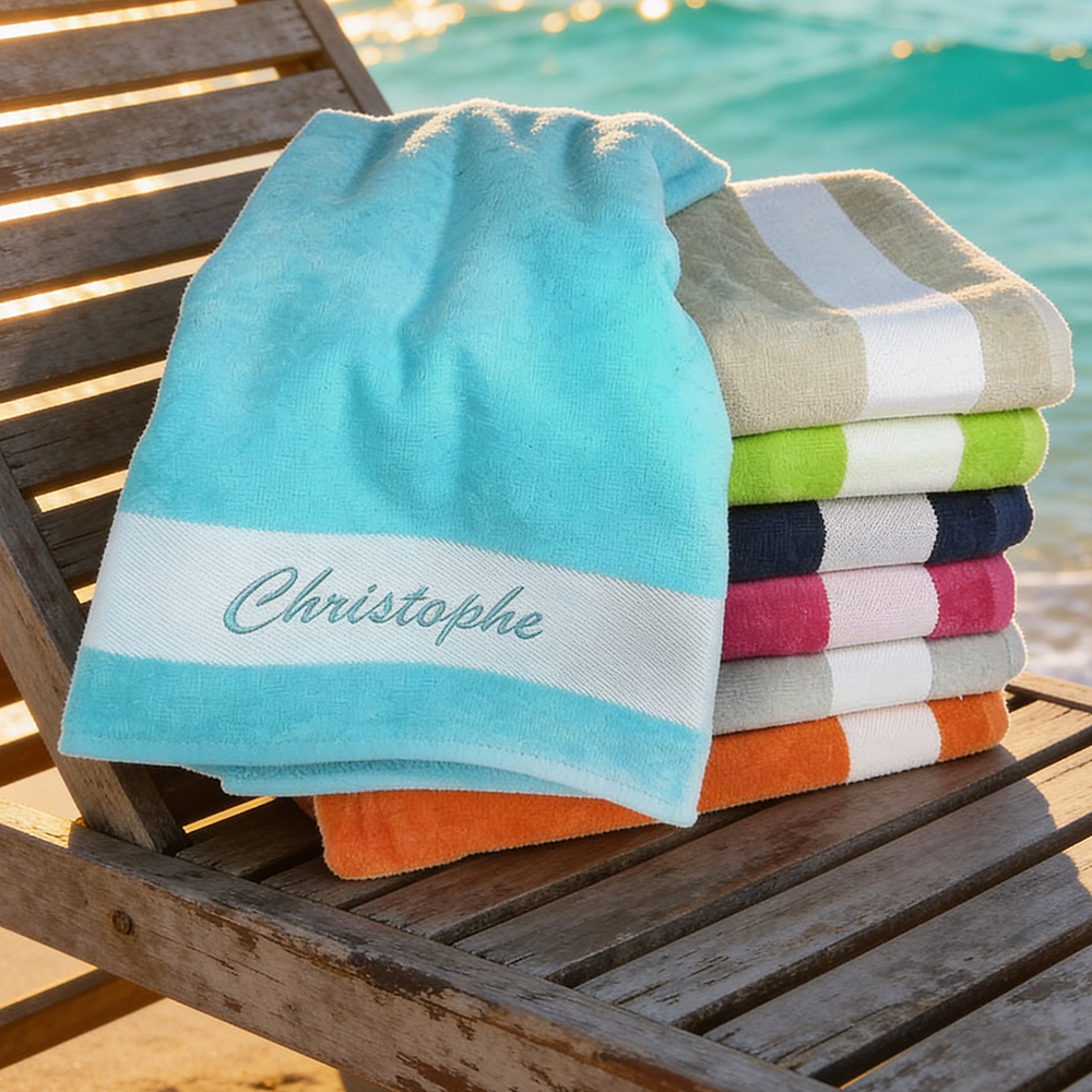 Ce drap de bain personnalisé sera idéal pour vos vacances à la plage ou à la piscine, personnalisez-le avec un texte ou un prénom brodé.
